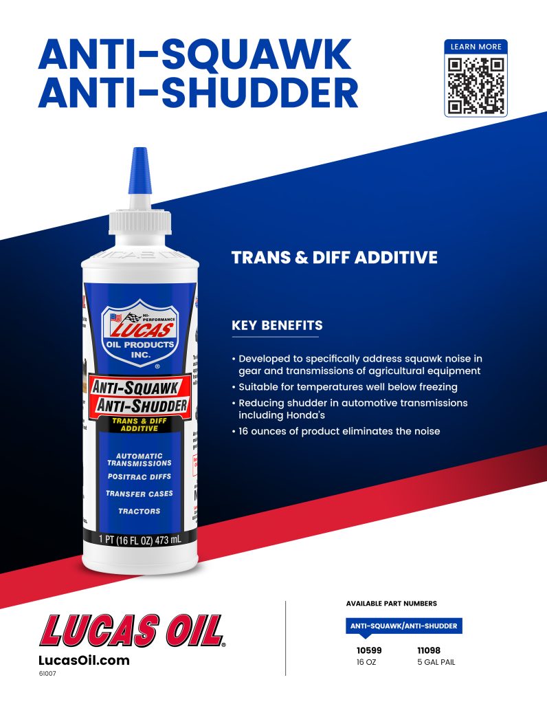 Lucas Anti-Squawk/Anti-Shudder Additive was developed to specifically address squawk noise in gear and transmissions of agricultural equipment at initial start up. Sixteen (16) ounces of product eliminates the noise and is suitable for use in temperatures well below freezing. Our product also has been prove to be effective in reducing shudder in automotive transmissions including Hondas.
