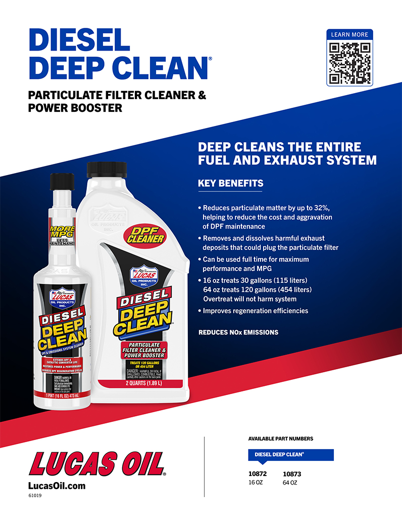 Lucas Diesel Deep Clean® is a new Lucas technology developed to reduce the cost and hassle of particulate filter maintenance. It is an excellent preventative maintenance product. It causes the fuel to burn much cleaner, thus eliminating a lot of particulate matter that would otherwise go into the exhaust system causing “regens.” It also cleans out much of the matter already trapped in the filter. This eliminates exhaust backpressure allowing the engine to run easier and cooler as well as lowering the aggravation and down time associated with particulate filters.