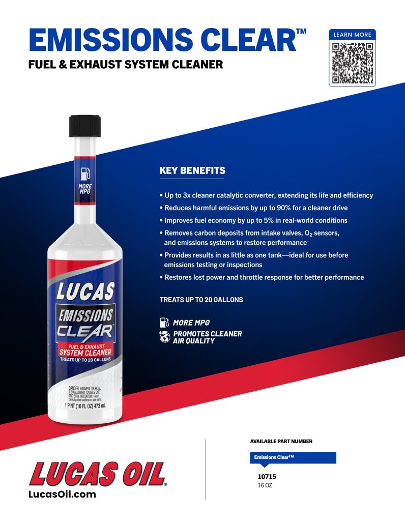 Lucas Emissions Clear™ Fuel and Exhaust System Cleaner is designed to enhance engine performance and keep your emissions system operating at its peak for the life of the vehicle. Engineered to be easily integrated into routine vehicle maintenance or before a vehicle inspection, expect to avoid costly emission system repairs and increased efficiency. Lucas Emissions Clear™ is a one tank treatment and provides a thorough clean out, compatible with any gasoline engine which highlights its versatility and reliability.