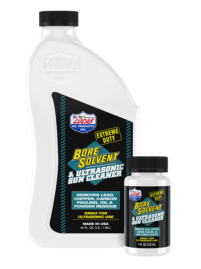 Used and recommended by major firearms manufacturers, Lucas Extreme Duty Bore Solvent & Ultrasonic Gun Cleaner is a premium blend of cleaning solvents and corrosion inhibitors. It easily removes carbon and powder residue from actions as well as copper and lead fouling from cylinders and barrels. The solvent based formula cleans deep to remove old oils and grease and provides a micro thin layer of rust and corrosion inhibitor on metal surfaces and bores. It is safe on polymers and factory applied firearm finishes.