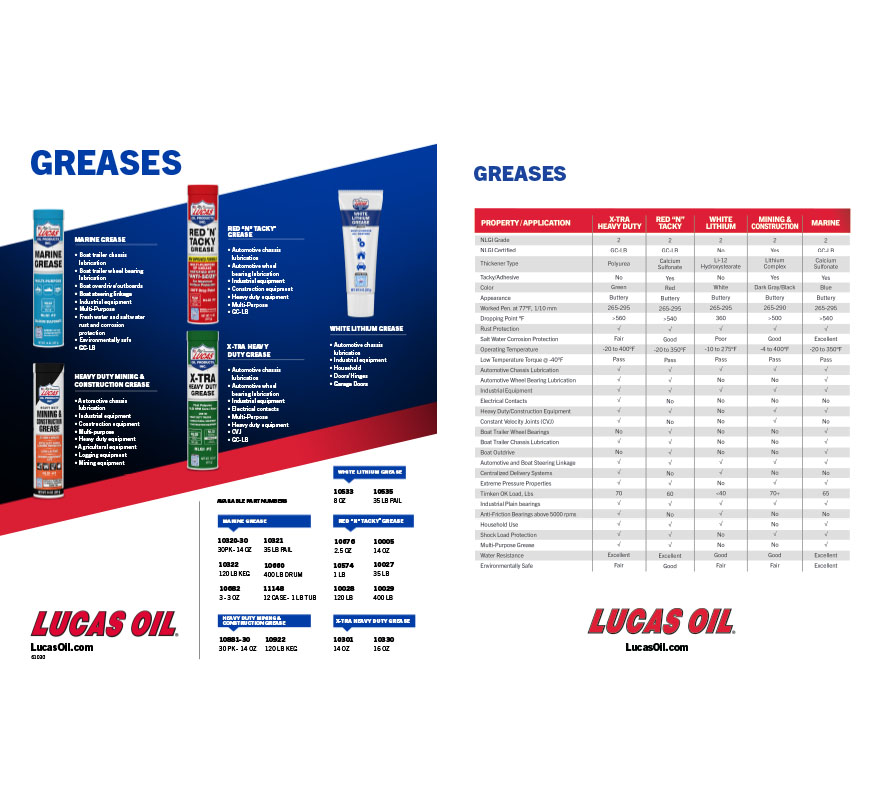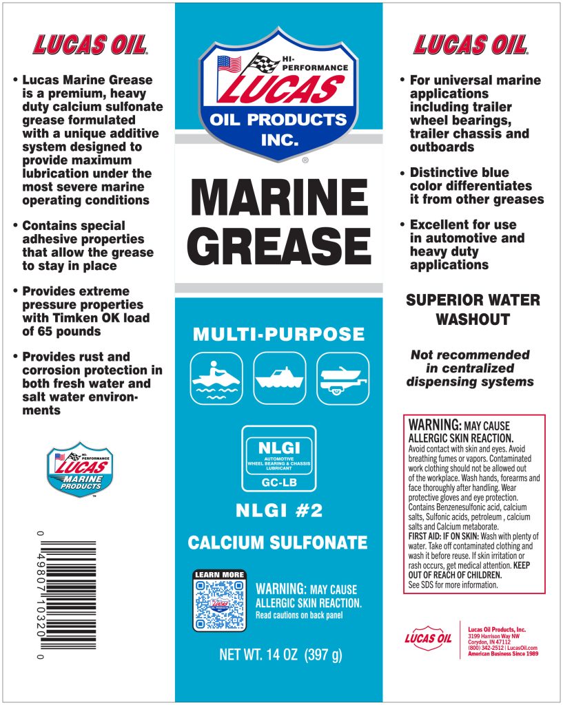 Lucas Marine Grease is a premium, extreme pressure, multi-purpose, heavy duty OBCS grease containing unique polymers, anti-wear agents and tackifiers with inherent rust and oxidation resistance to provide the highest performance properties. It has been designed to lubricate under the most severe operating conditions in marine applications and because of its adhesive properties, it effectively stays in place.